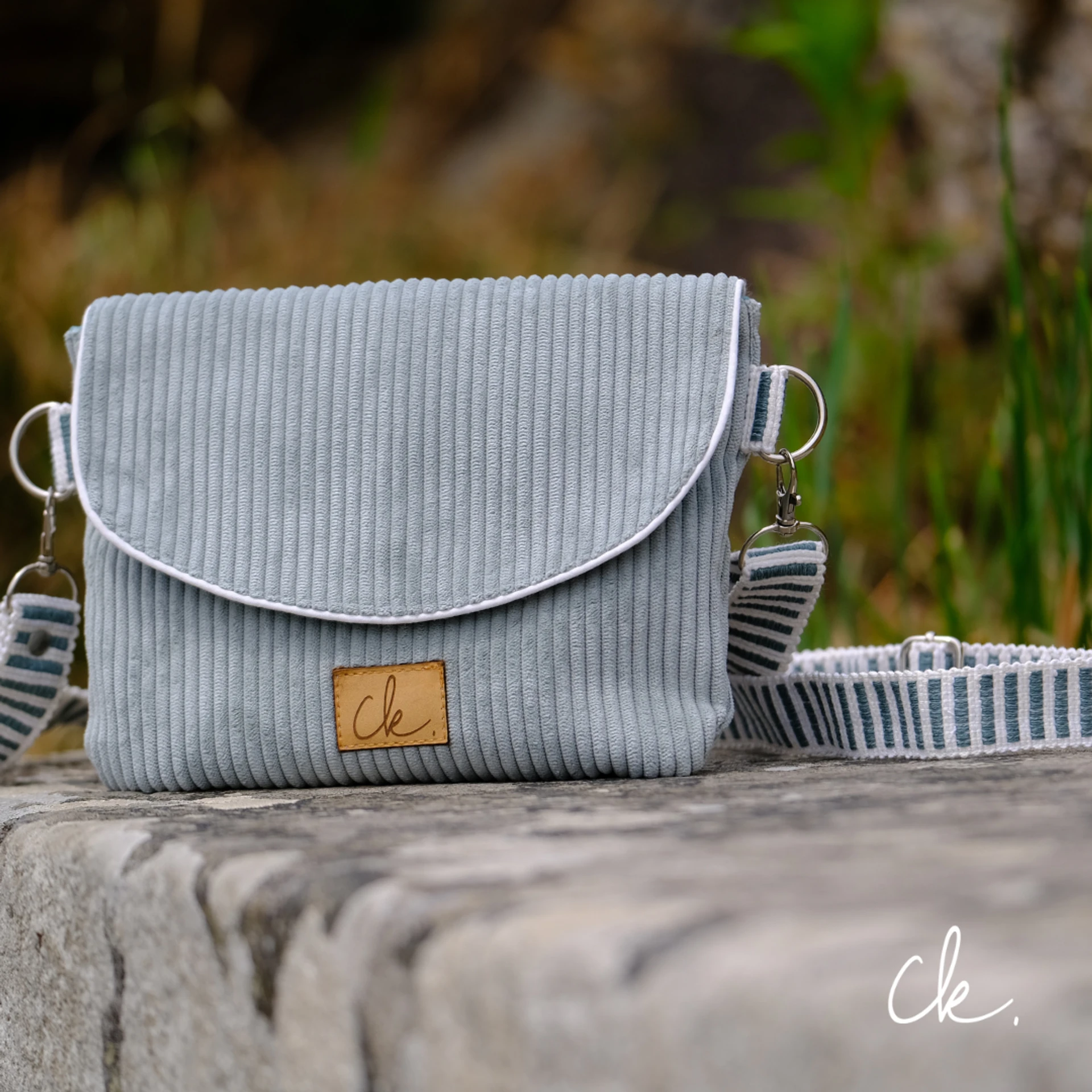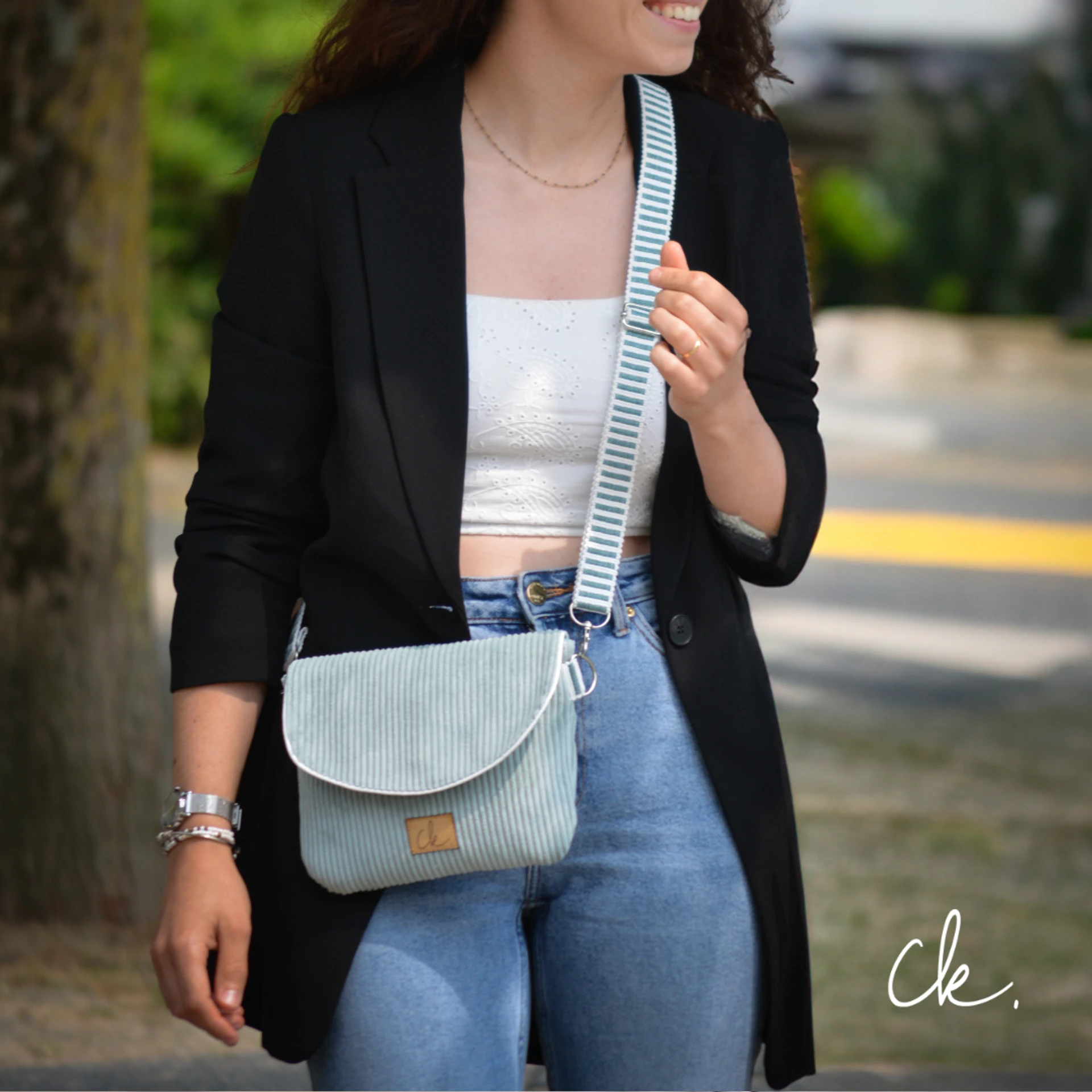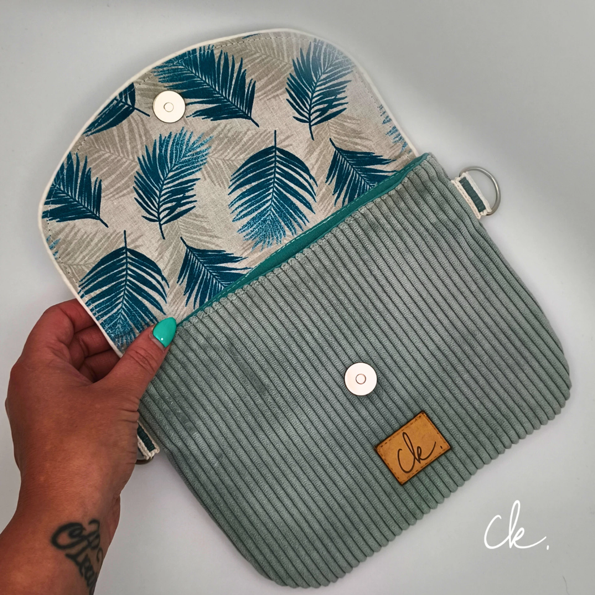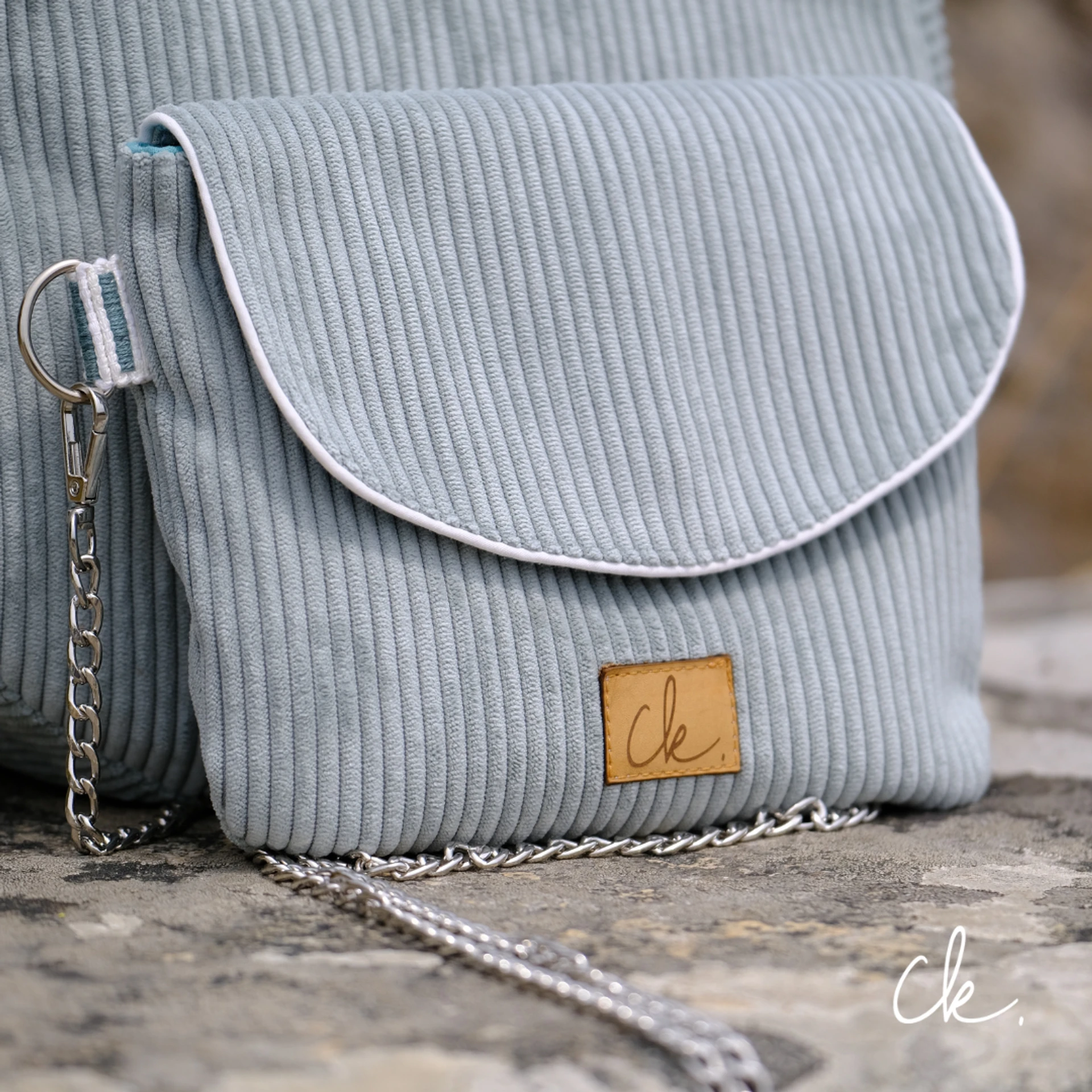 La pochette Étain marie un velours côtelé bleu ciel et une doublure végétale, ainsi qu'un passepoil blanc pour rehausser le rabat.