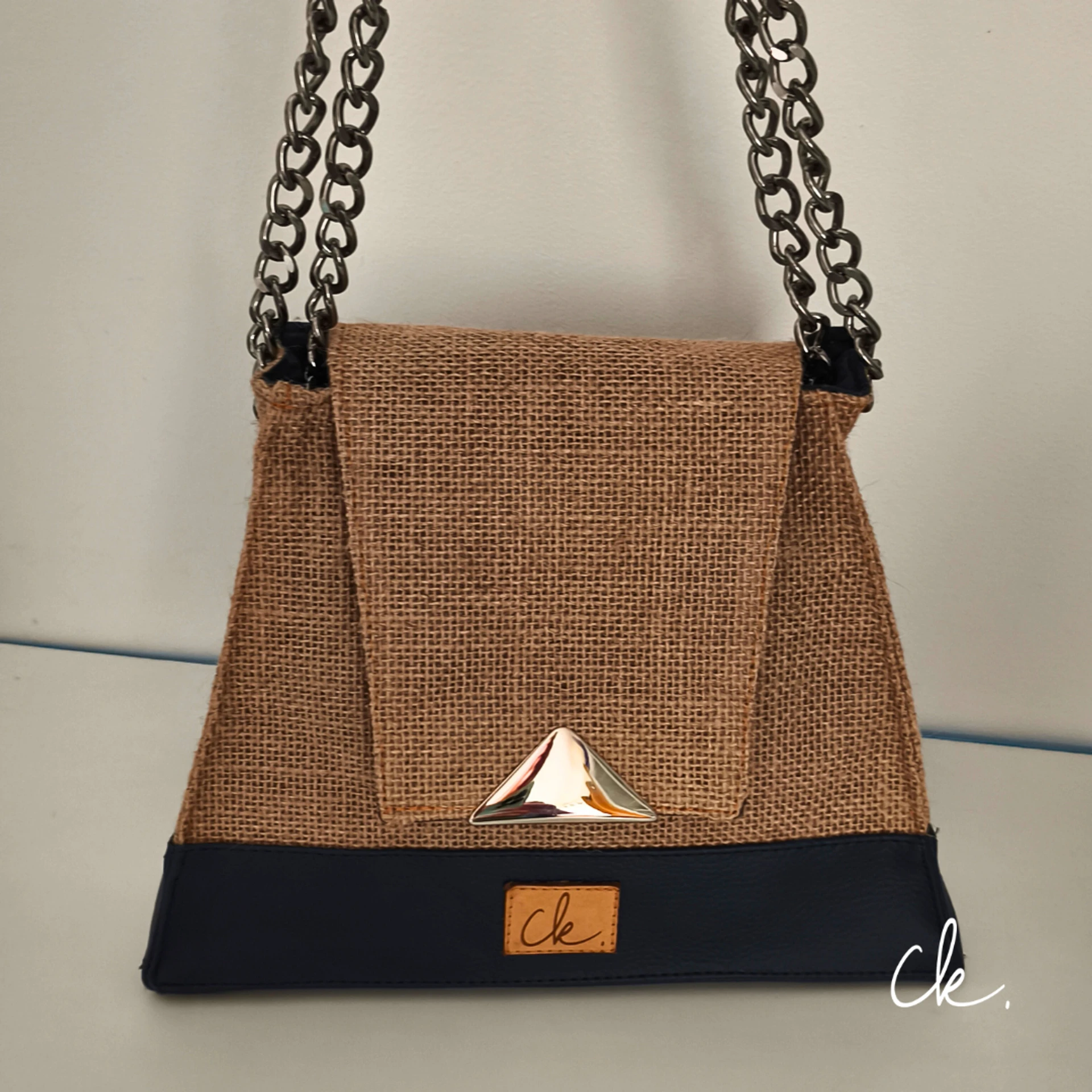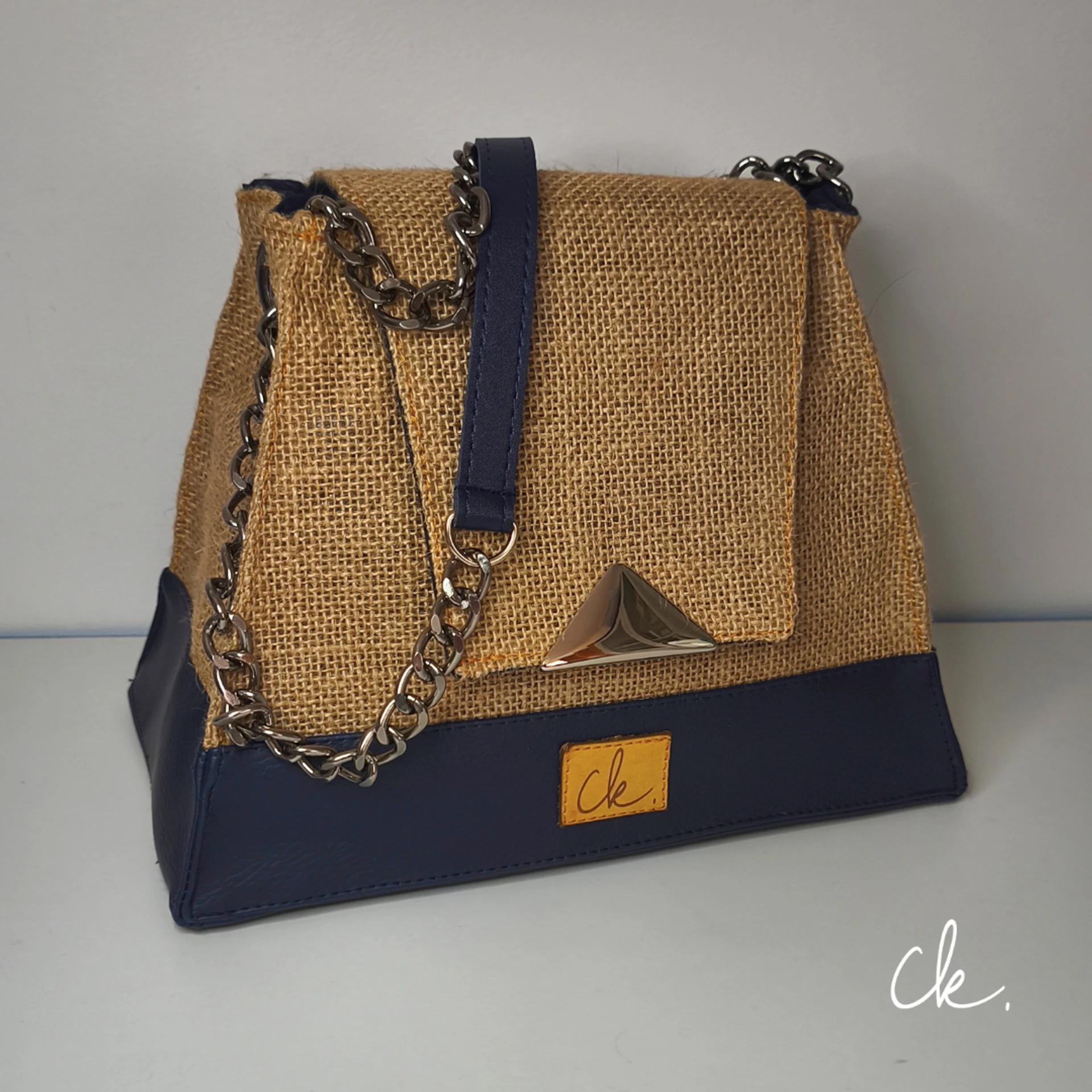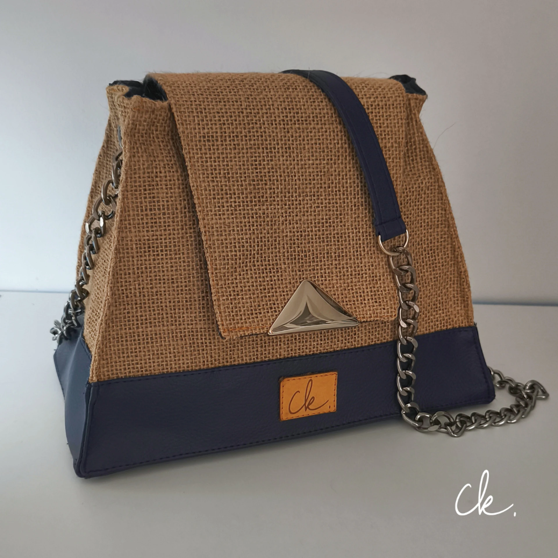 Confectionné en toile de jute texturée et similicuir bleu marine, il évoque les éléments — la terre sèche et la mer profonde. Sa chaîne métallisée, sa fermeture aimantée triangulaire et ses pieds de sac renforcent son allure structurée et moderne.